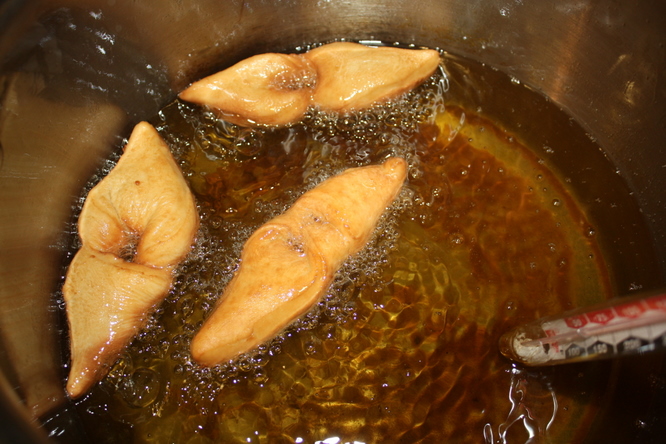 - Fry the dough in the deep fat turn over carefully with a metal spatula, tongs or skimmer or something that you can lift them out with.