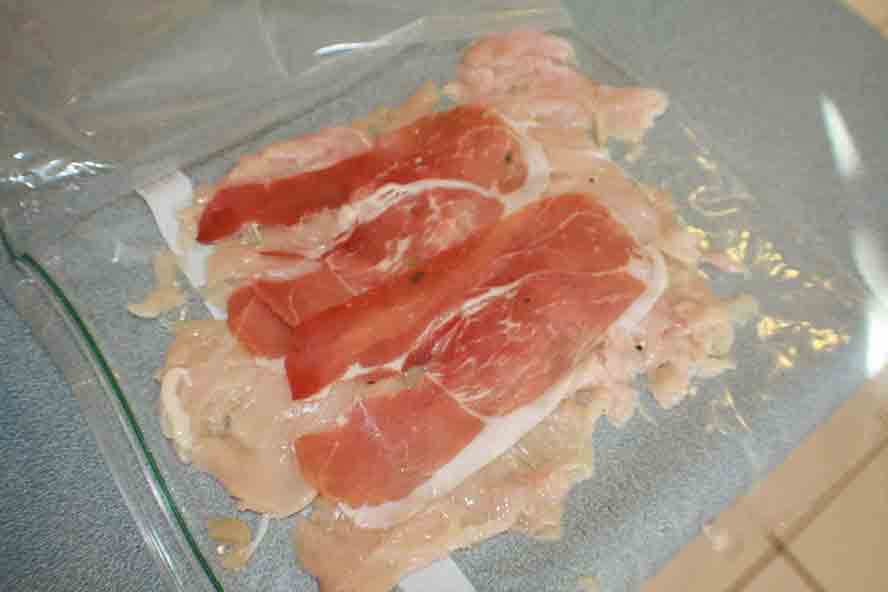 - Open the plastic bag top and place the 4 slices Black Forest Ham on the chicken breast.