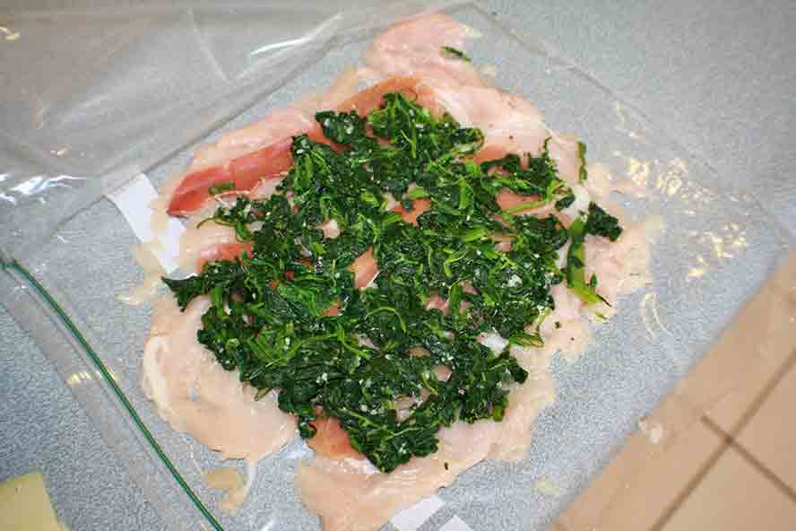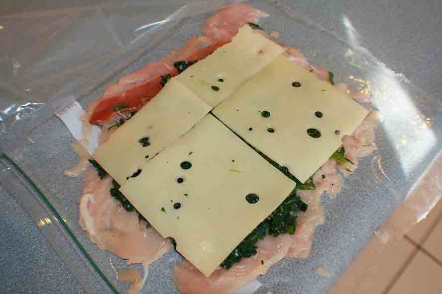 Lift the bag and roll the chicken breast up. The plastic bag helps to roll it neatly.