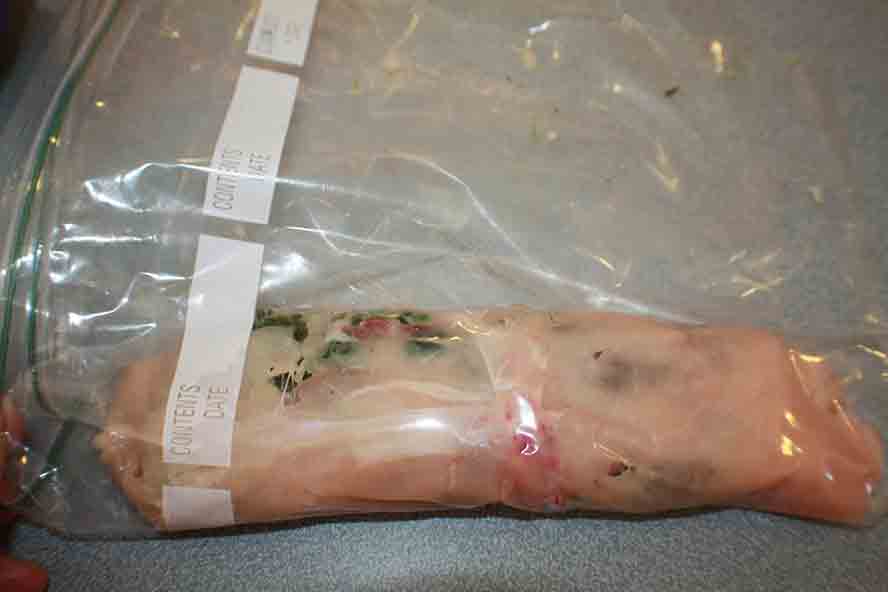 - Lift the bag and roll the chicken breast up. The plastic bag helps to roll it neatly.